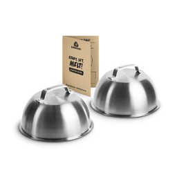Mit den Burgerglocken bringst du deinen Burger unter die Geschmacks-Haube: Mehr Hitze, mehr Schmelz, mehr Geschmack! Dank 14,5 cm Durchmesser und 7 cm Höhe haben selbst XXL-Patties genug Platz, um sich mit Käse vollzuladen. Die Glocke hält die Hitze, damit dein Käse perfekt zerfließt – genau so, wie es sein soll! Und weil doppelt besser schmeckt: Beide Hauben passen easy nebeneinander auf deine Plancha. Perfekt für Cheeseburger im Doppelpack!