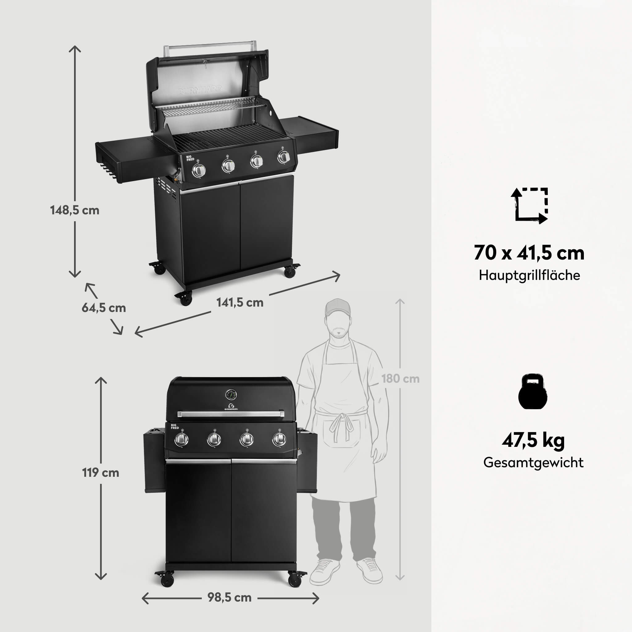 947140, 947141 Big FRED Deluxe 4-Brenner Gasgrill in Schwarz mit Seitenkochfeld, Food Container und geschlossenem Unterschrank