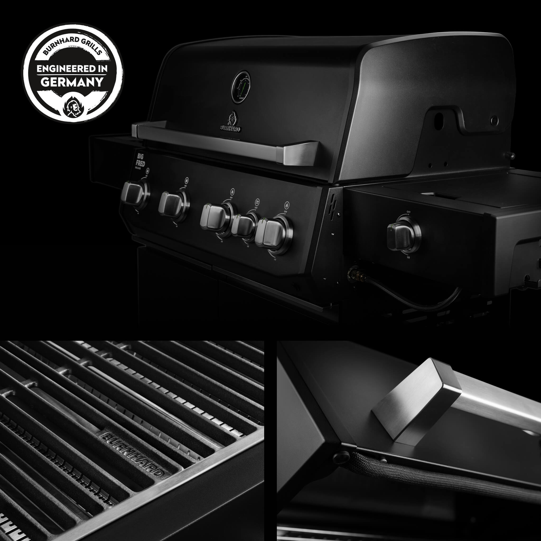 Die FRED Series 4 ist die konsequente Weiterentwicklung unseres Allround-Gasgrills. Wir haben vor allem bei Materialqualität, Konstruktion und Hitzeverteilung nachgeschärft. Zum Beispiel kommen jetzt Aluminium-Druckguss-Elemente an Brennkammer- und Deckel-Seiten zum Einsatz, die für eine noch bessere Wärmespeicherung & Hitzeverteilung sorgen. Außerdem besteht die Brennkammer bei allen Modellen (auch Black & Green Edition) aus Edelstahl – inkl. Fettauffangschale und Warmhalterost.