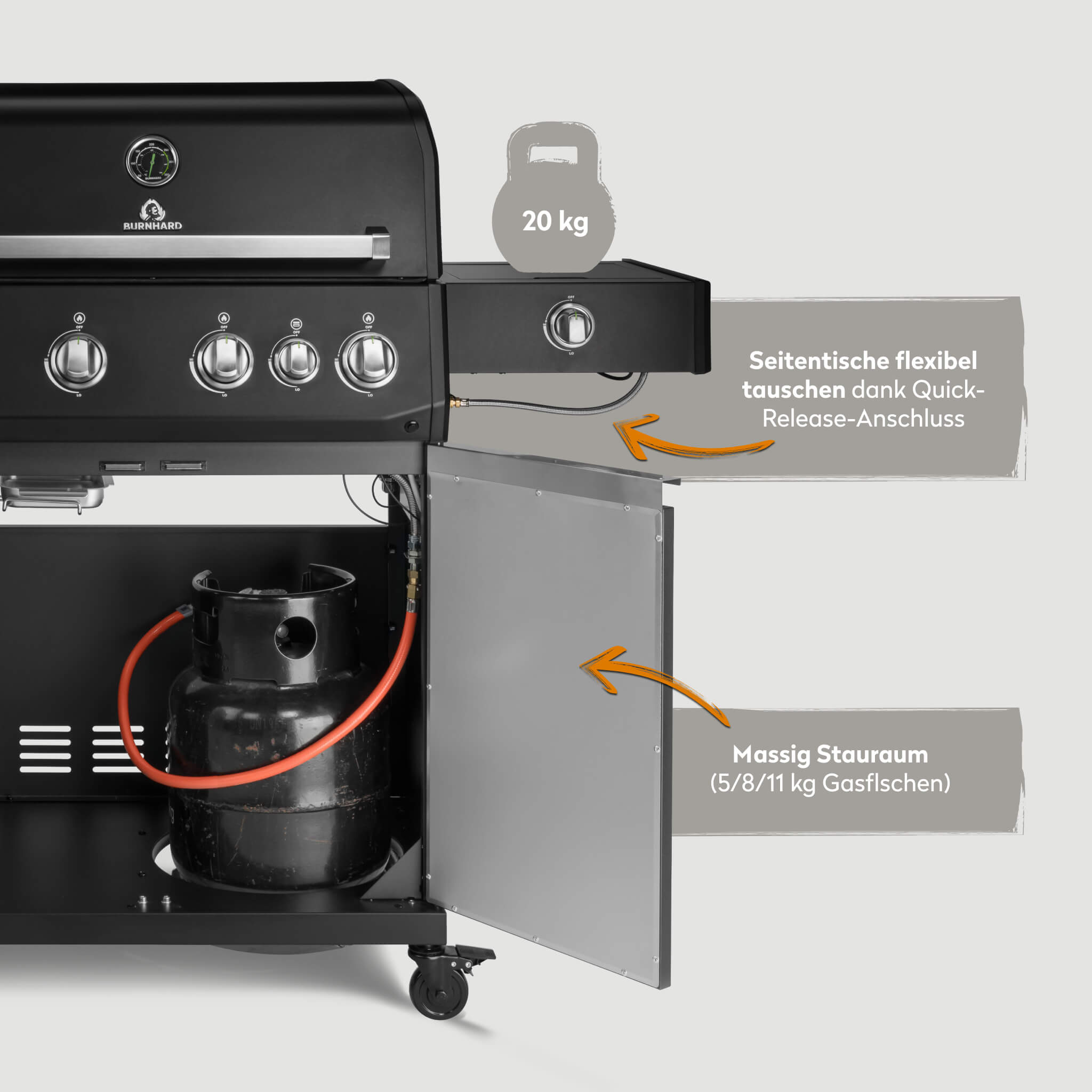 WICHTIG: Der Heckbrenner sollte nicht gleichzeitig mit den Hauptbrennern und dem Infrarot-Keramikbrenner in der Grillkammer verwendet werdet. Durch die extrem hohe Hitzeentwicklung könnte sich das Material verziehen oder stark verfärben.