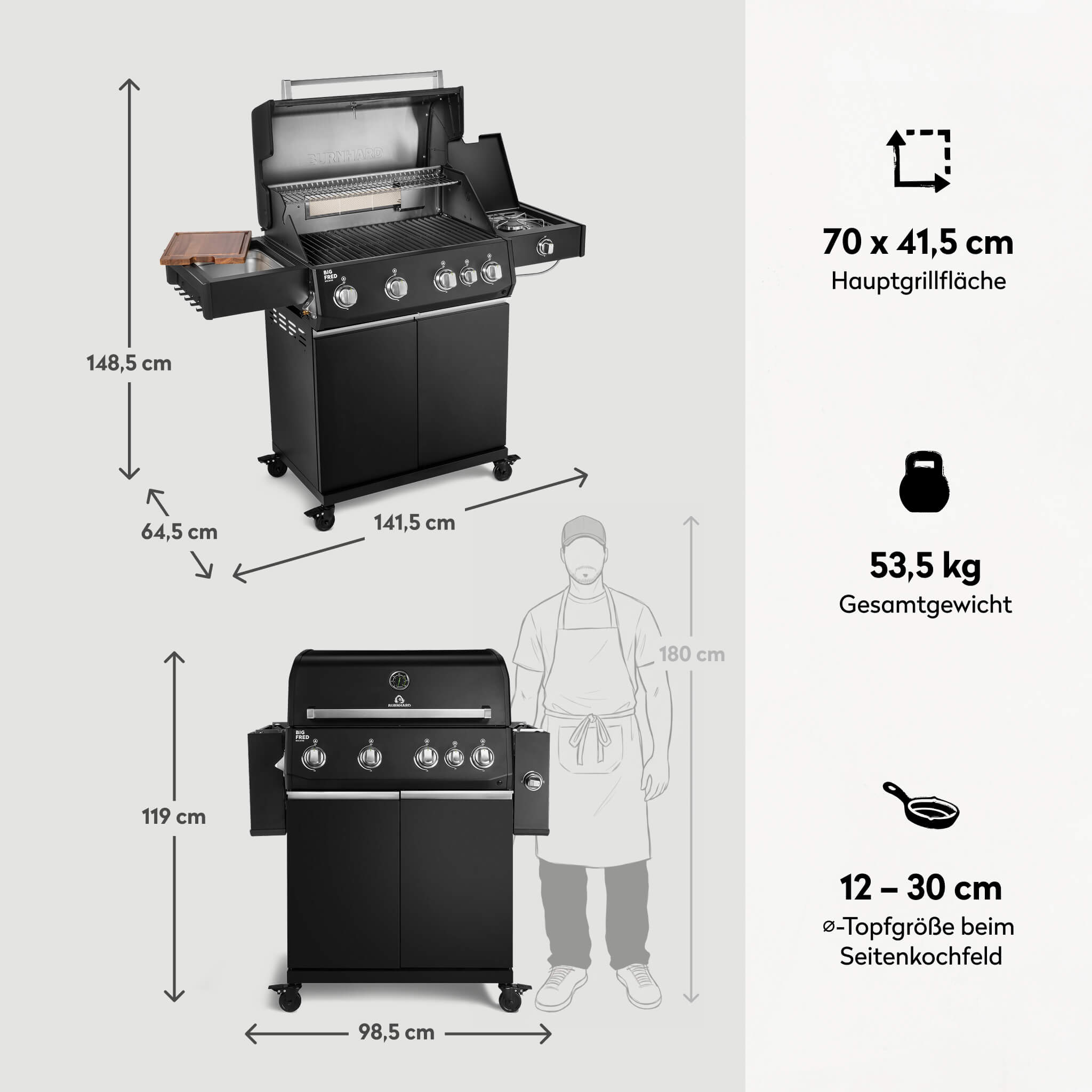 947140, 947141 Big FRED Deluxe 4-Brenner Gasgrill in Schwarz mit Seitenkochfeld, Food Container und geschlossenem Unterschrank