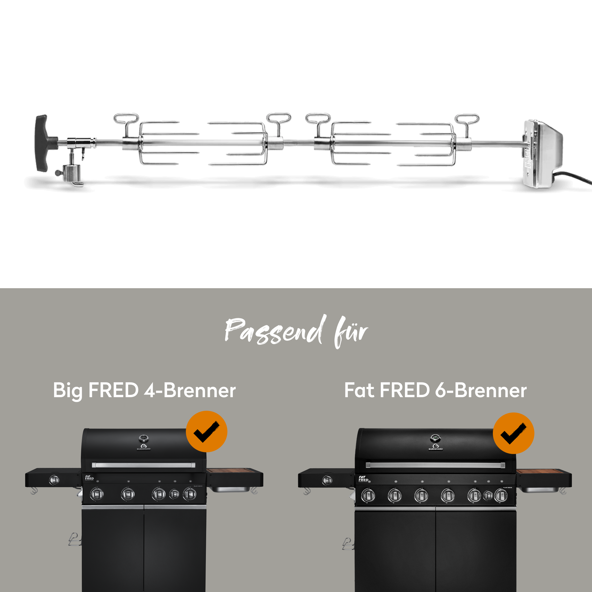 Bock auf richtig fettes BBQ? Dein Drehspieß packt mit seinem 4 Watt starken Elektromotor auch amtliche Spießbraten, Gyros oder Grillhähnchen ganz locker. Du kannst deinem Fleisch bei 2 Umdrehungen pro Minute eine schön gleichmäßige Bräunung verpassen. Damit dabei alles rund läuft, kommt dein Drehspieß mit praktischem Gegengewicht zur Feinjustierung.